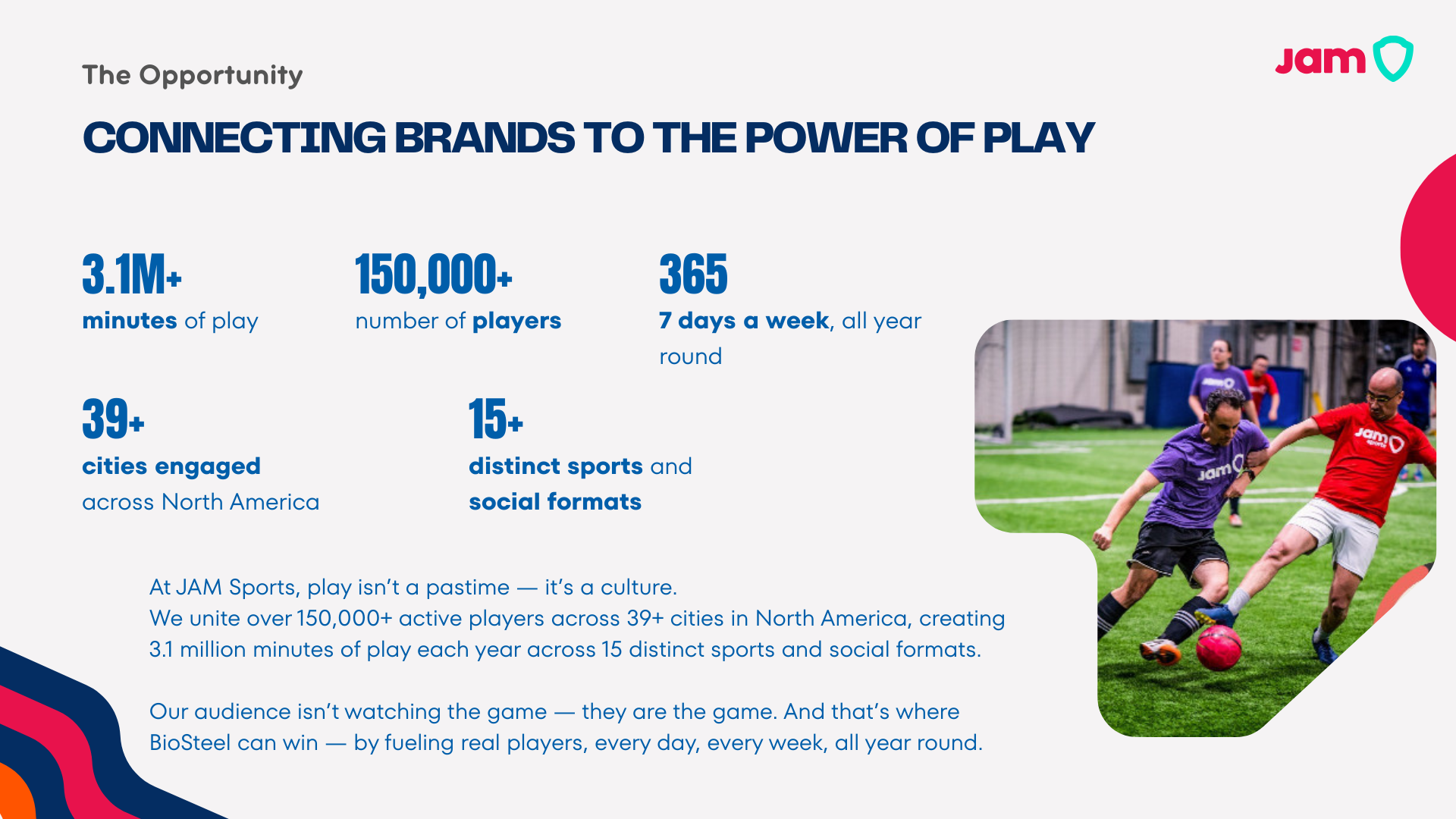 JAM Sports is North America’s largest adult recreational sports and social play platform, connecting 150,000+ active players across 39+ cities through year-round leagues and tournaments. The platform operates at the intersection of sport, community, and lifestyle — creating consistent engagement with highly active adults.