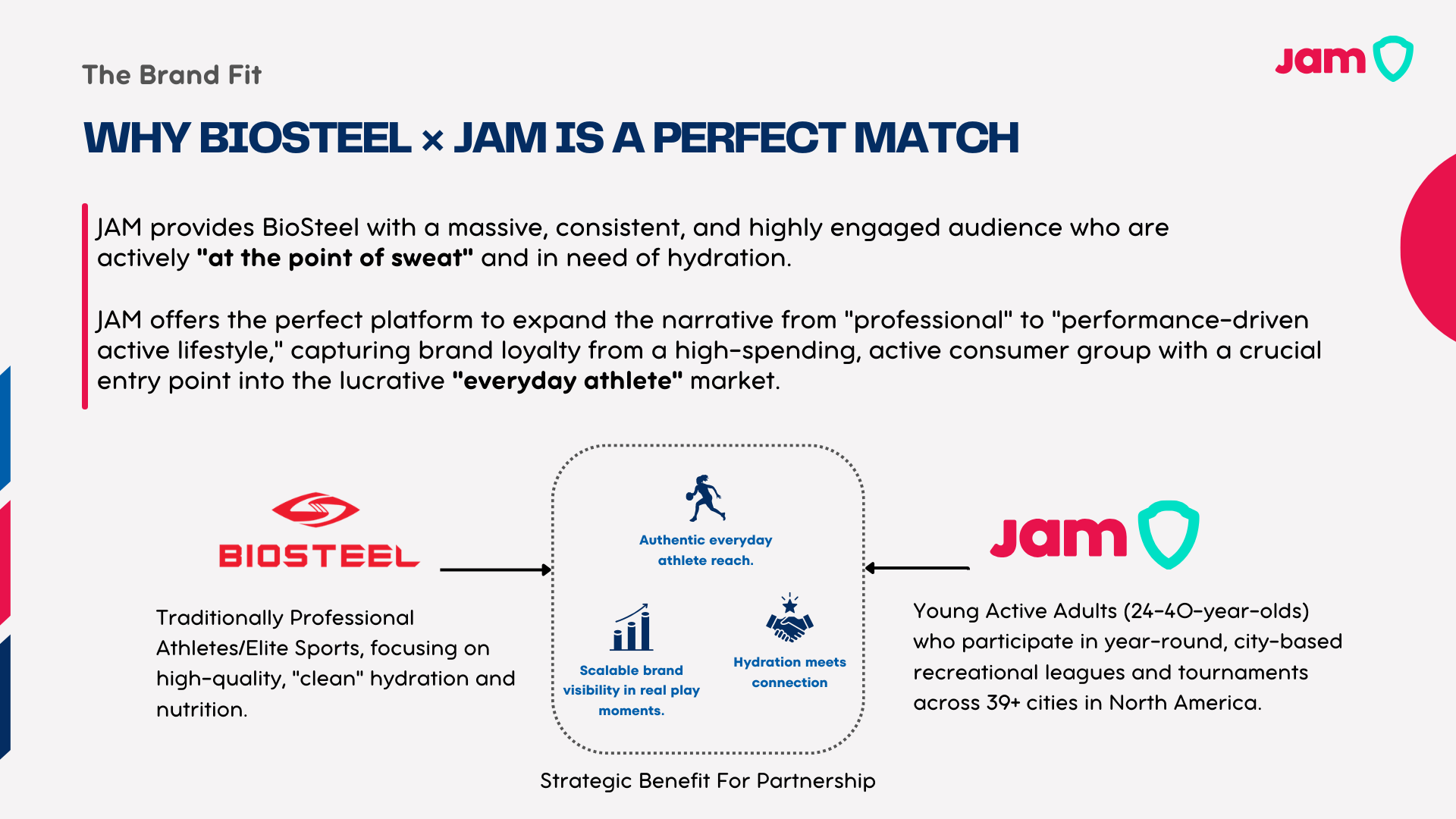 In parallel, I developed a full partnership proposal deck (JAM x BioSteel) to demonstrate how grassroots sport platforms can expand brand narratives from elite performance into the “everyday athlete” market through experiential activations, content storytelling, and measurable engagement.